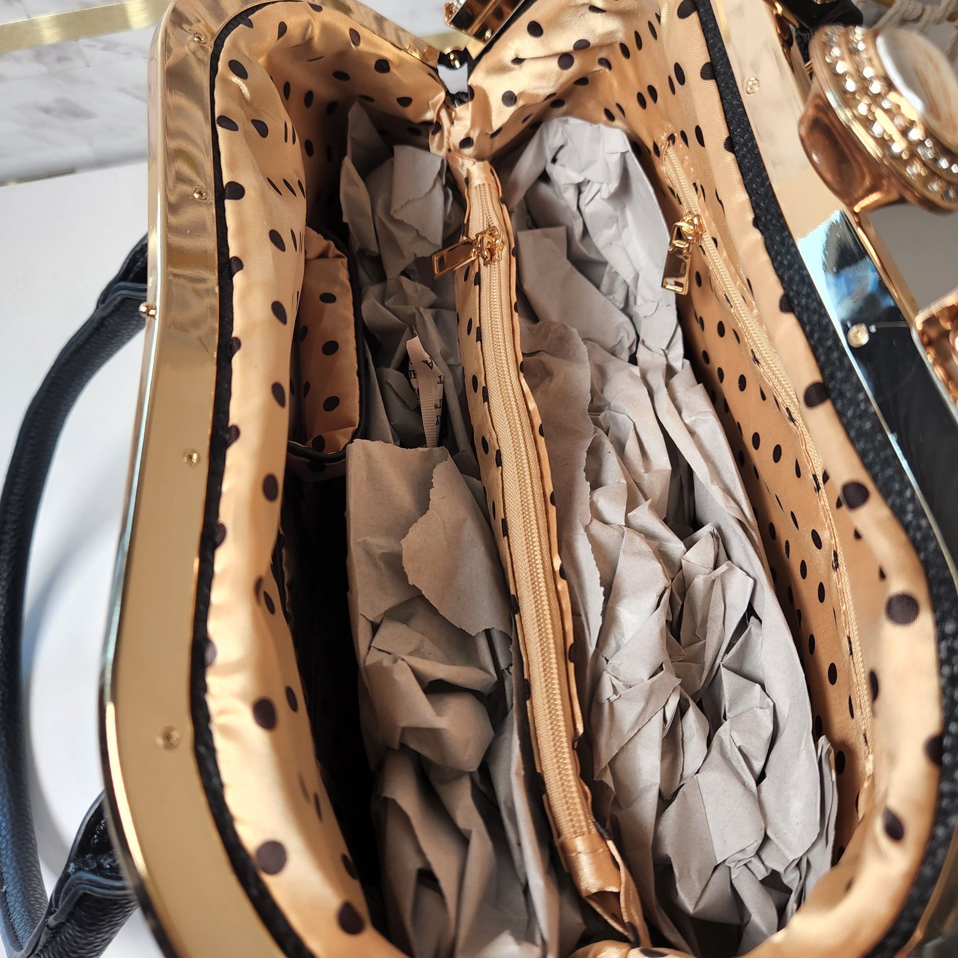 This bag has one zip back pocket, a detachable shoulder strap, two interior slip pockets with one zip pocket and one center divider pocket. It has an a-frame clasp closure with extra rhinestones, metal feet and a faux leather exterior with lined interior.