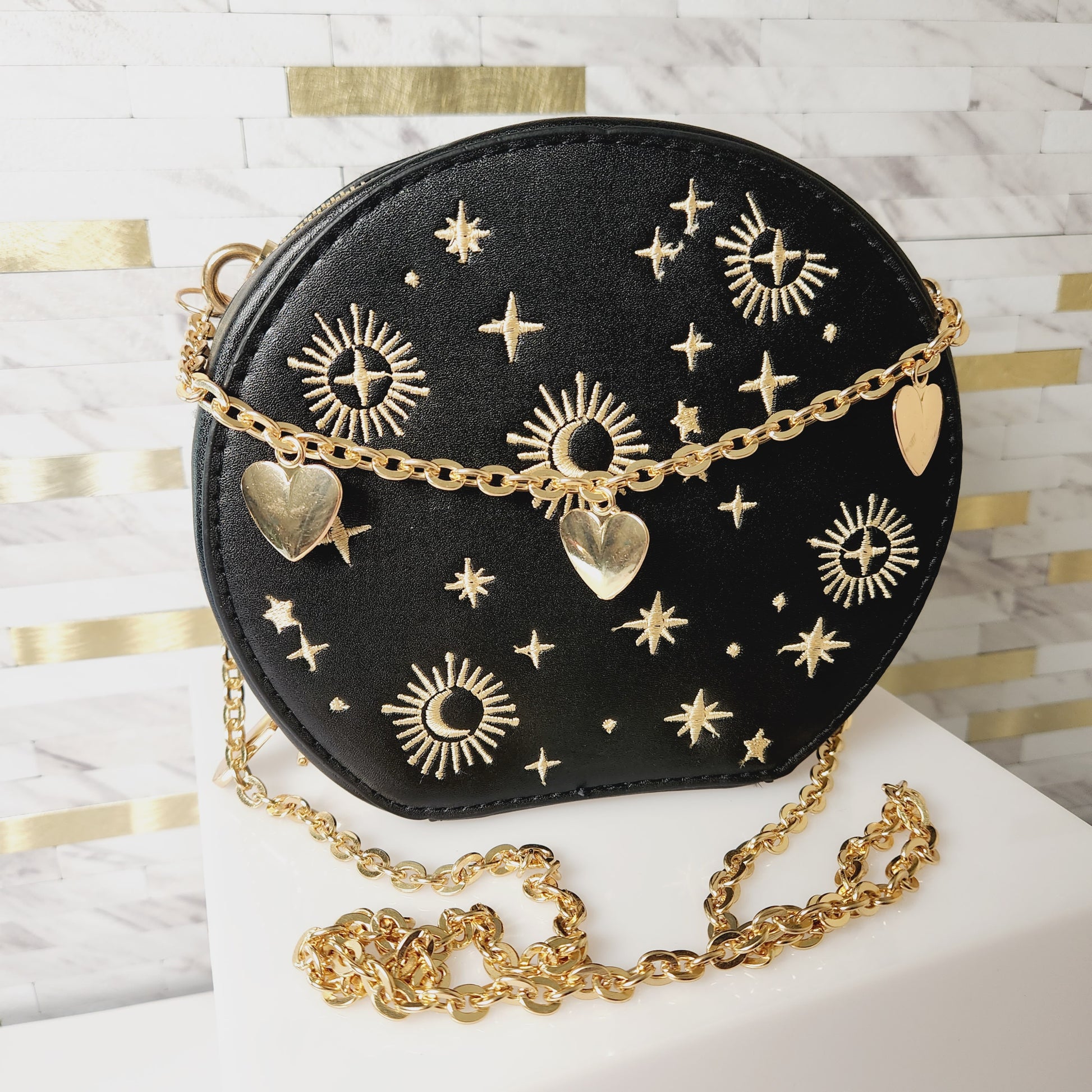 Black Celestial Round Embroidery Crossbody Purse with Heart Chain