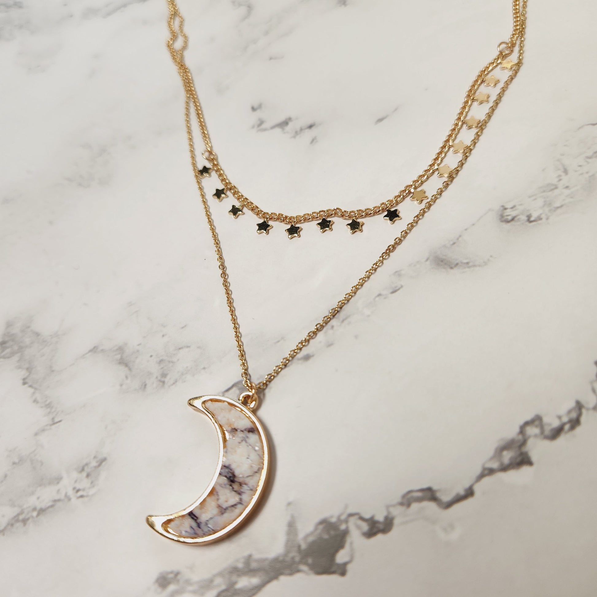 A small but gorgeous necklace set featuring elements from our galaxy! This layered necklace has a crescent moon pendant with tiny star charms.