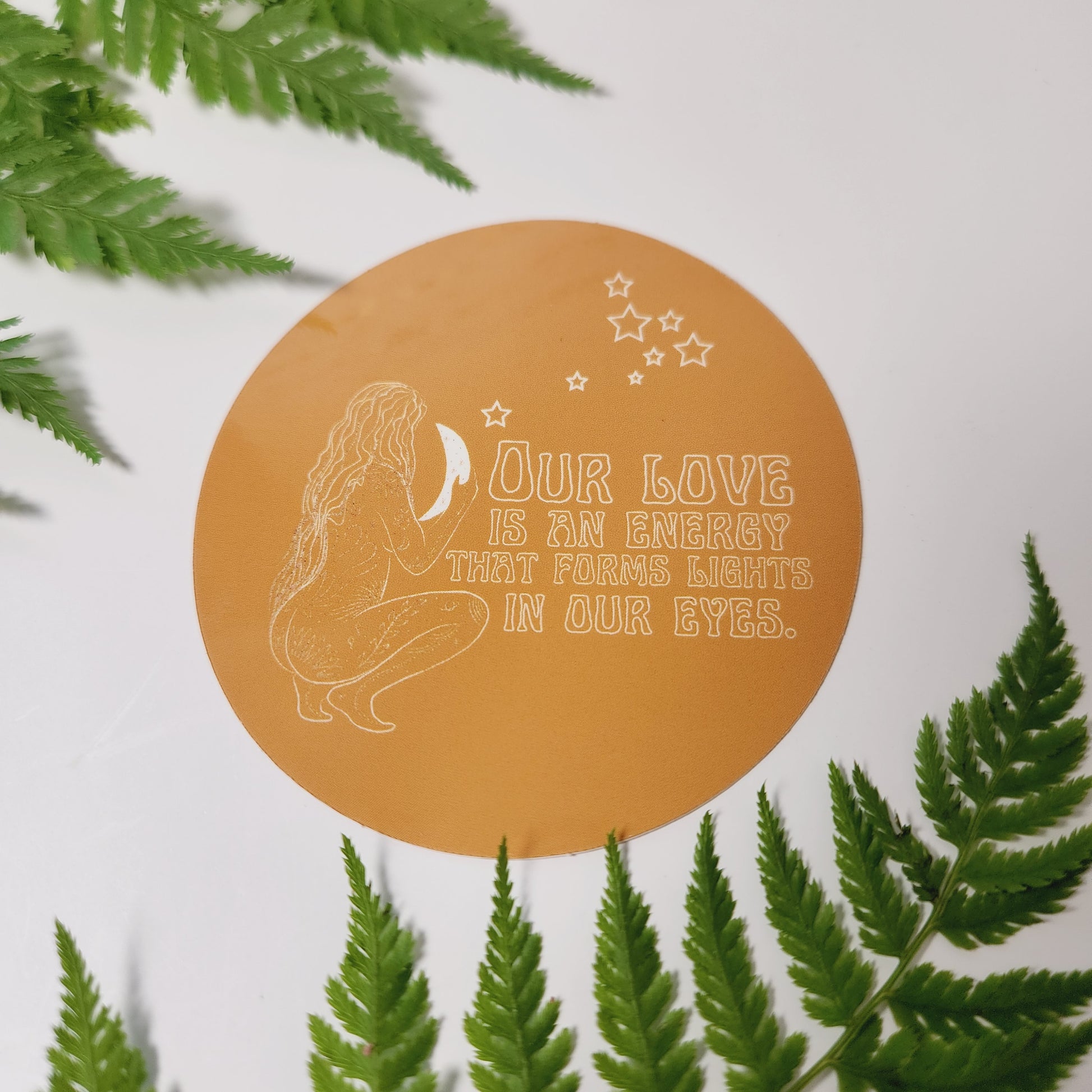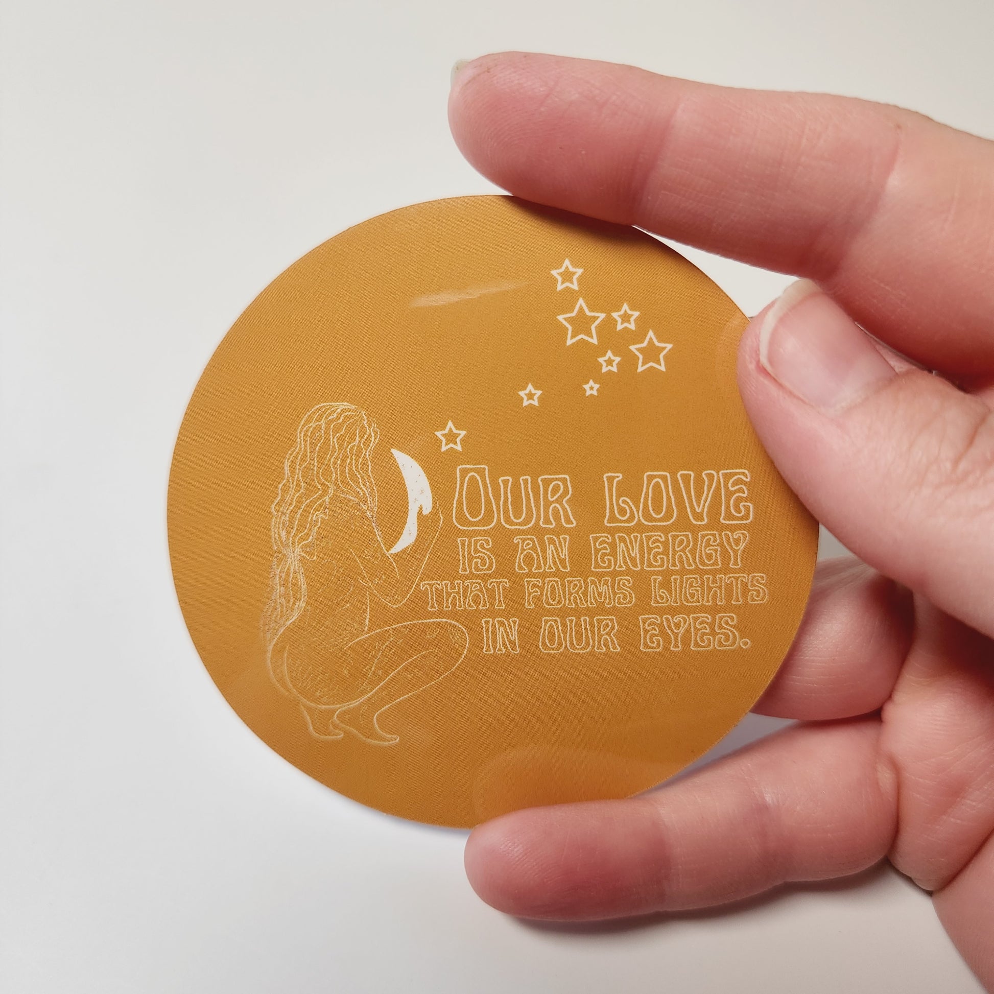 After years of writing in my journal as a tween and teenager, I have lots of inner dialogue and words that are waiting to be created into art. This sticker features part of a poem I wrote about love. It features a celestial design with a woman holding the moon in front of a dark yellow background.