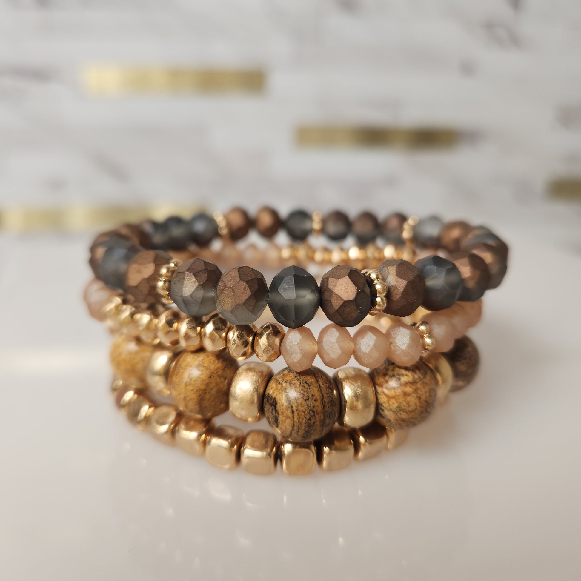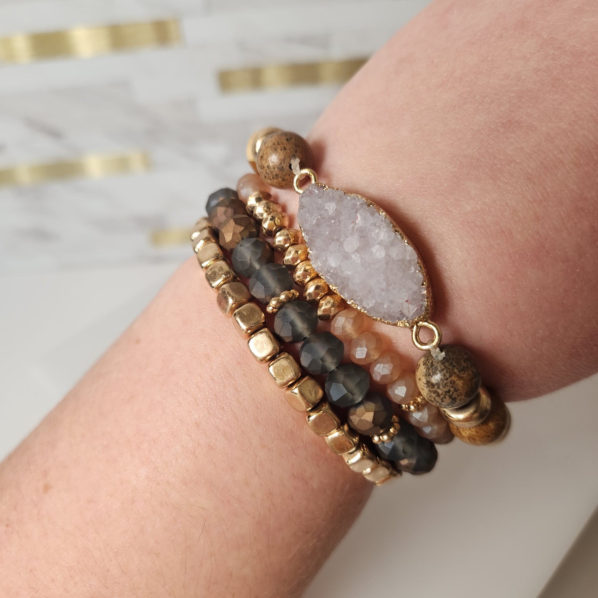 The four bracelets feature semi precious natural stone, metal gold tone, and glass beads with a large druzy accent.