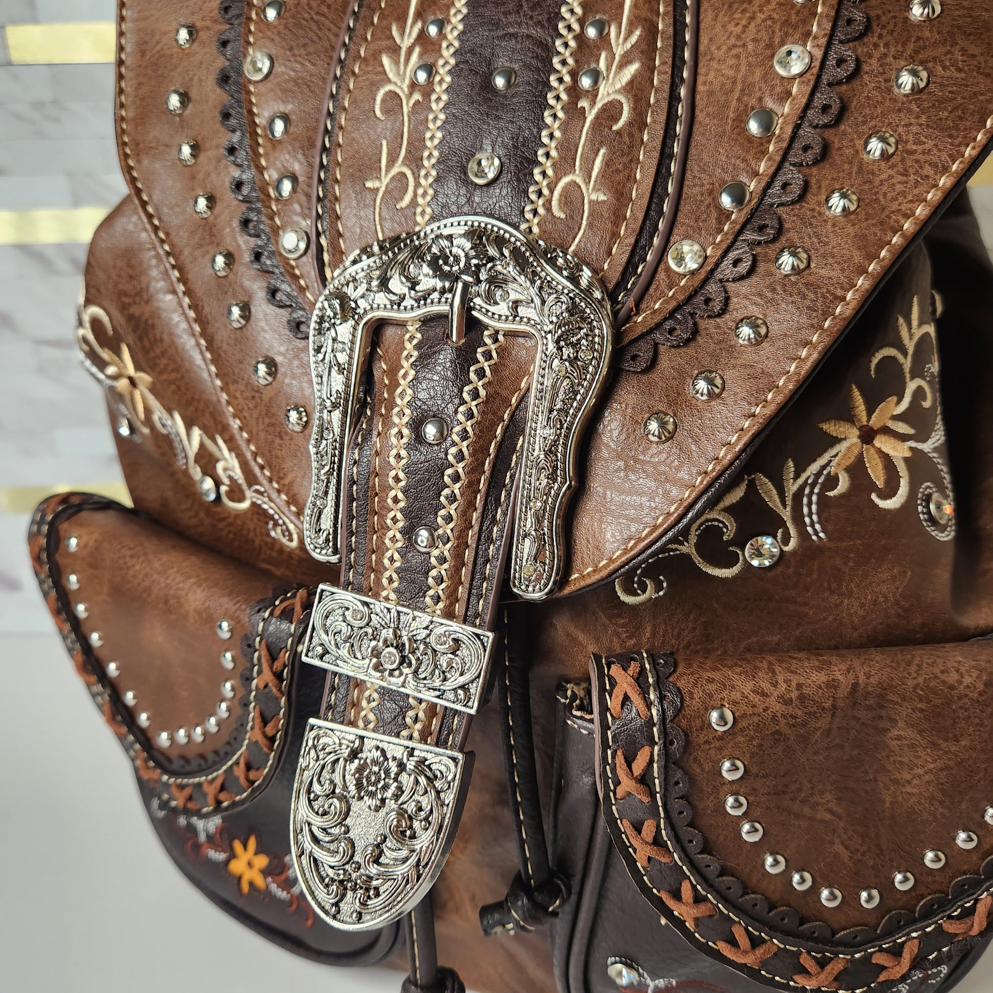 Whether you are looking for a new style to incorporate into your wardrobe or already have western accessories, you are going to LOVE this backpack. It's gorgeous and has a bit of bling from the rhinestones and silvertone buckle.